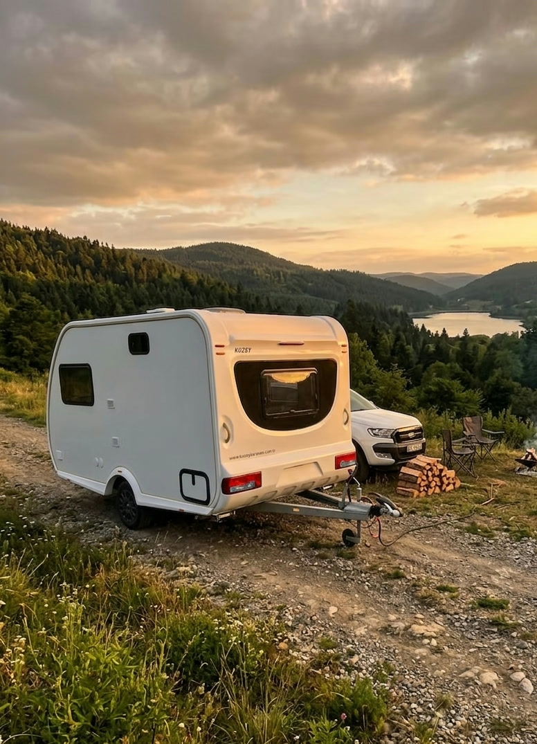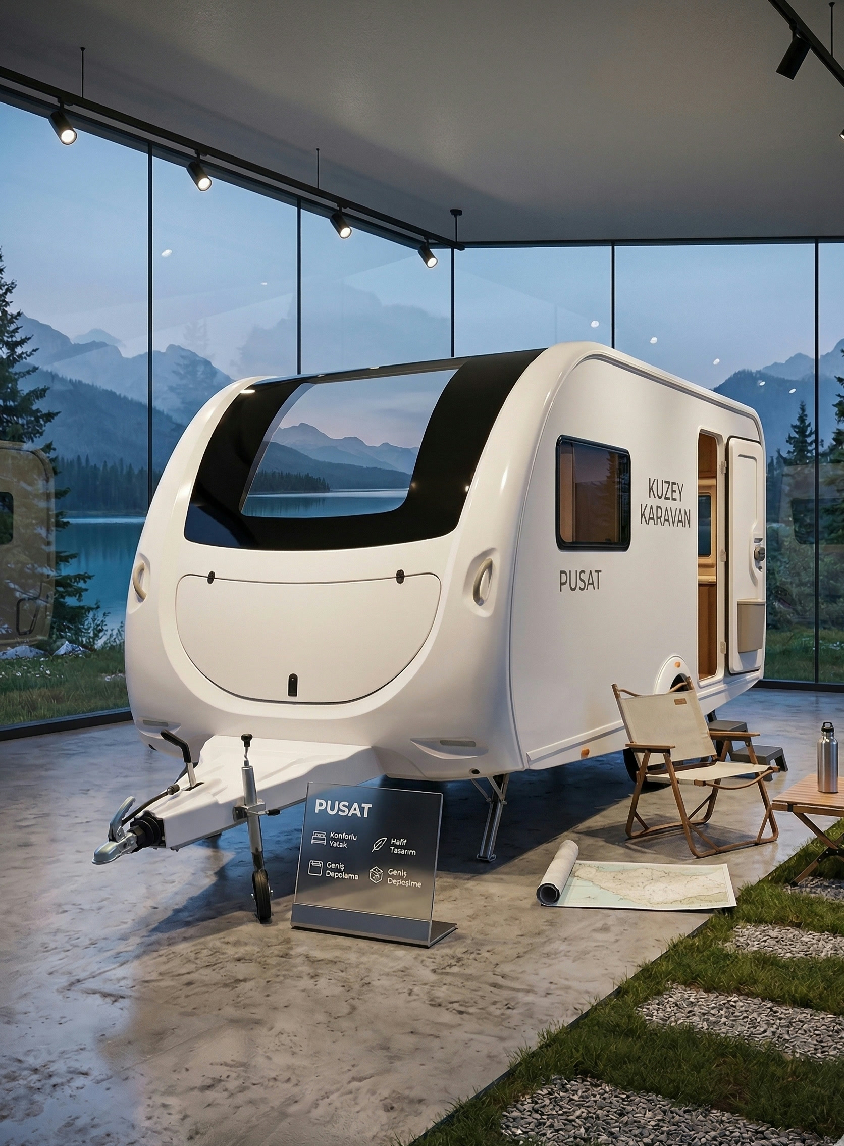 PUSAT, tente ve ek yaşam alanı ile birlikte kamp noktasına yerleştiğinde boyutundan daha büyük bir kullanım hissi verir. Kompakt gövde, sahada hızlı kurulum ve pratik dolaşım avantajı sunar.