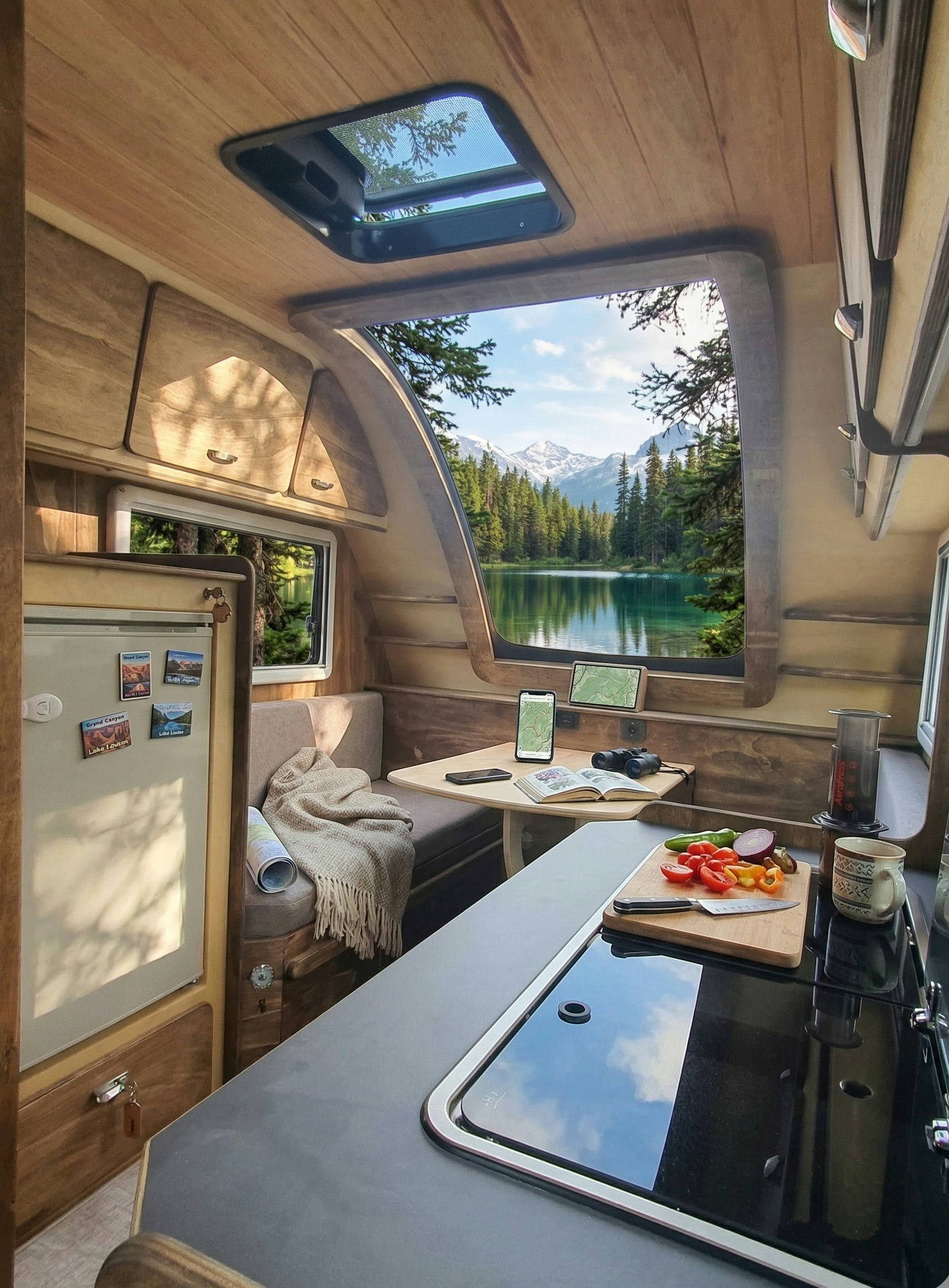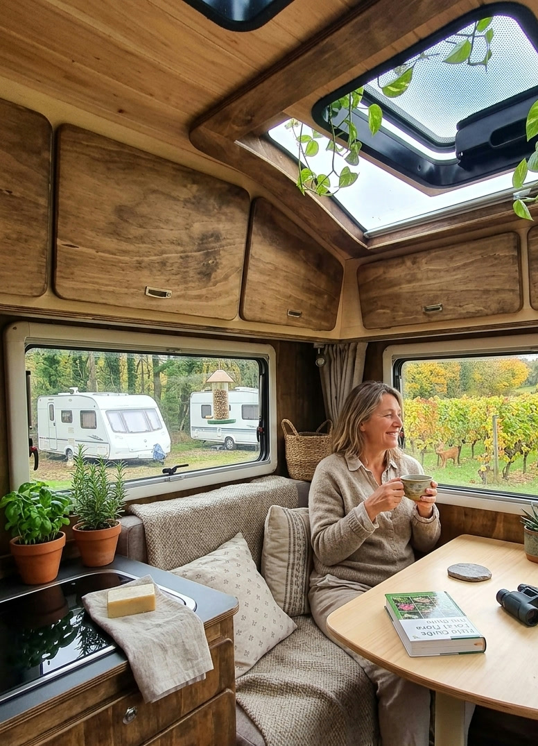 3-4 kişilik yaşam planı, 6 kişilik oturma kurgusu ve 150 lt temiz su altyapısıyla kompakt ama güçlü bir gezi çözümü.