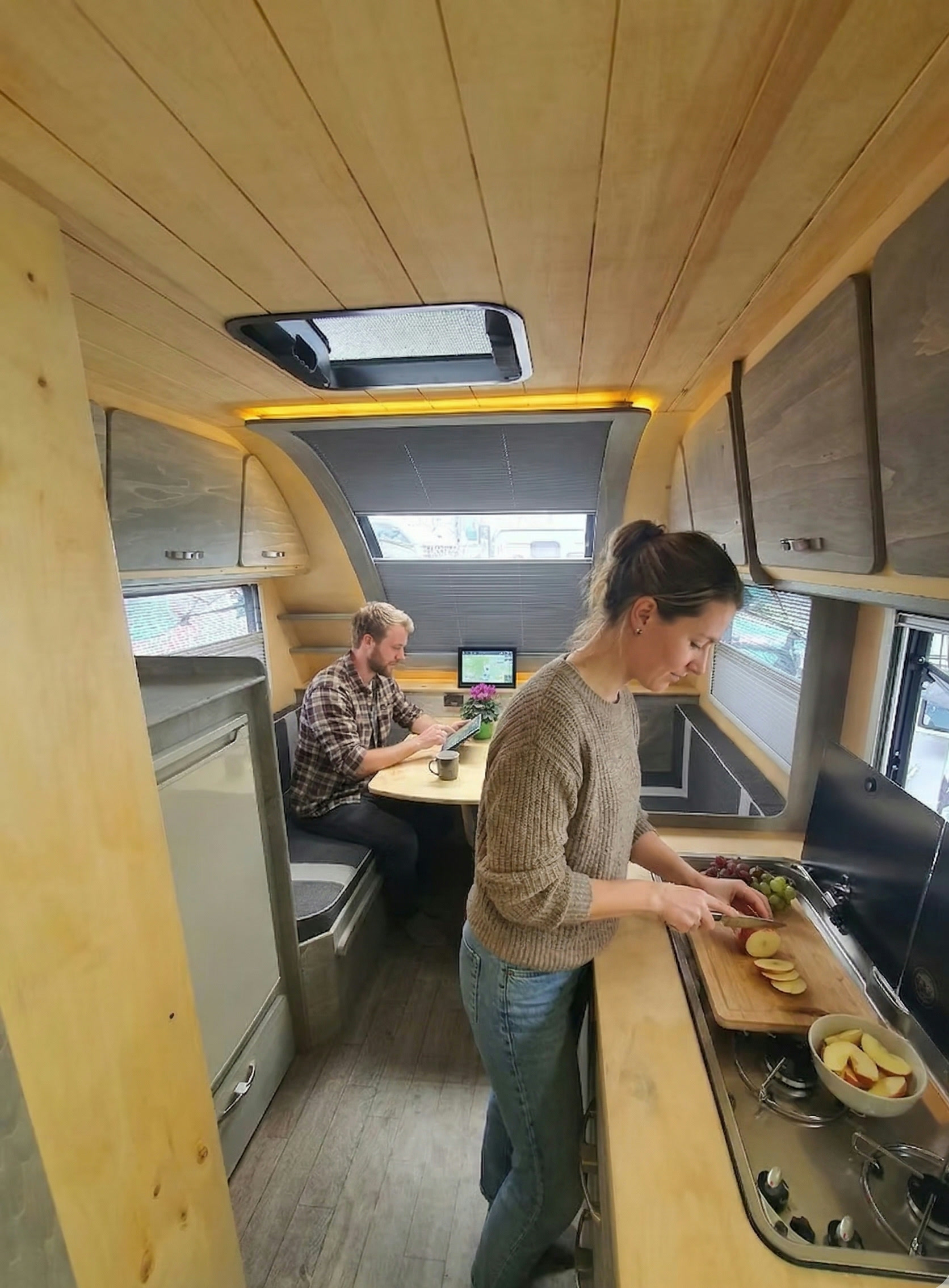 Tezgâh, ocak, lavabo ve saklama çözümleri PUSAT'ın kompakt ölçüsüne rağmen uzun rota kullanımına cevap verecek şekilde kurgulandı. Günlük düzeni bozmadan içeride hareket etmeyi kolaylaştıran lineer bir akış sunar.