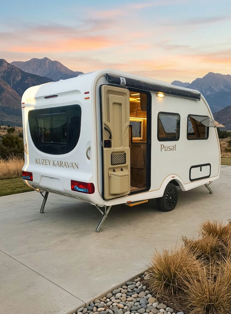 PUSAT, 3-4 kişilik kullanım için geliştirilen 4.20 x 2.14 ölçülerinde kompakt bir yaşam karavanıdır. 6 kişilik oturma düzeni, 3-4 yatak kapasitesi, 150 lt temiz su deposu, WC altyapısı, güneş paneli sistemi ve 5 kW Webasto ısıtma ile hem kısa kaçışlar hem de uzun yol planları için dengeli bir çözüm sunar. Özel imalat 3 mm çelik şase, 2.5 mm tek parça polyester üst yapı ve doğal yağ ile renklendirilen iç mobilyalar, modelin üretim karakterini belirler.